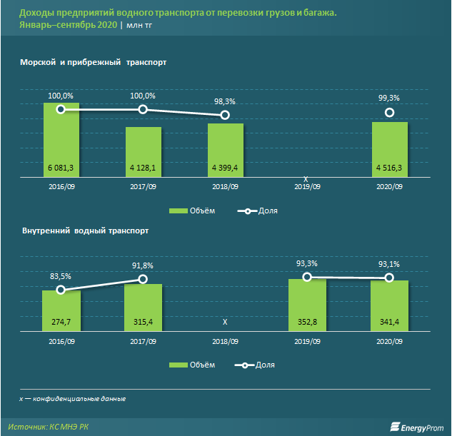 Доходы предприятий морского и прибрежного транспорта от перевозки грузов за январь–сентябрь 2020 года составили 4,5 млрд тг и заняли 99,3% от общего объёма доходов в секторе.