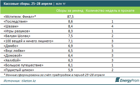 Кроме «Мстителей», в тройку лидеров по бокс-офису в РК также вошли военная драма «Последствия» режиссёра Джеймса Кента (8,6 млн тг, в прокате 1 неделю) и ещё один супергеройский фильм — на сей раз из вселенной комиксов DC Comics — «Шазам», собравший 8,4 млн тг (в прокате 4 недели).