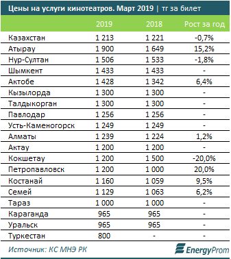 Напомним, к апрелю 2019 года казахстанские киноманы платили за билеты в среднем по 1213 тг — на 0,7% меньше, чем годом ранее. Дороже всего посещение кинотеатров обходилось кинолюбителям Атырау (1900 тг за билет, +15,2% за год) и Нур-Султана (1506 тг за билет, −1,8% за год).