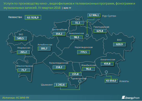 В прошлом году объём услуг по производству кино- и видеофильмов, телепрограмм, фонограмм и музыкальных записей в РК составил почти 62 млрд тг — сразу на 23,3% больше, чем в аналогичном периоде прошлого года.