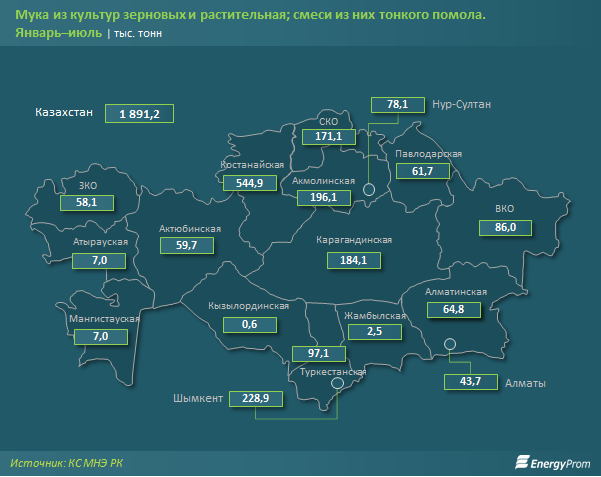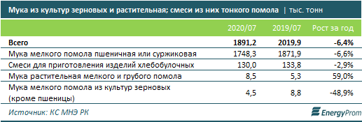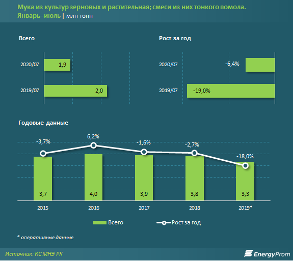 За январь–июль 2020 года мукомолы РК произвели 1,9 млн тонн муки — на 6,4% меньше, чем годом ранее.