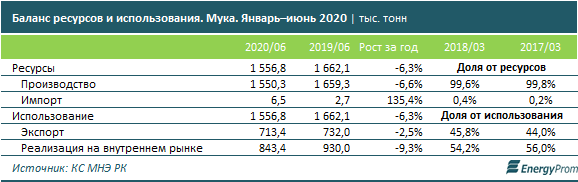 По итогам первого полугодия казахстанские компании обеспечили спрос (экспорт плюс реализация на внутреннем рынке) на муку практически полностью (на 99,6%). Было импортировано всего 6,5 тыс. тонн муки (годовой рост — в 2,4 раза).