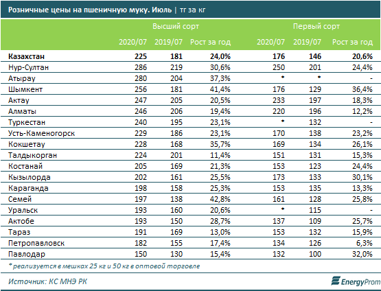 В июле 2020 года на базарах и в магазинах страны пшеничная мука высшего сорта стоила 224,7 тг за килограмм (сразу плюс серьёзно бьющие по кошелькам казахстанцев 24% за год), первого сорта — 176,4 тг за килограмм (плюс значительные 20,6% за год).