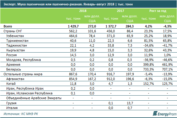 Ключевой импортёр казахстанской муки по итогам января–августа 2018 года — Афганистан (почти 60% внешних поставок РК в натуральном выражении): 854,94 тыс тонн. Впрочем, это на 6,3% меньше в сравнении с аналогичным периодом прошлого года.
