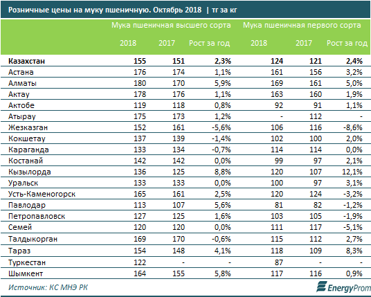 На внутреннем рынке страны в розничных точках продаж пшеничная мука первого сорта по итогам октября 2018-го подорожала на 2,4% за год, до 123,9 тг за кг. Самые высокие цены среди крупных городов и мегаполисов РК зафиксированы в Алматы (169 тг за кг, +5% за год) и Актау (163 тг за кг, +1,9% за год). Самое значительное удорожание отмечено в Кызылорде (+12,1% за год, до 120 тг за кг).