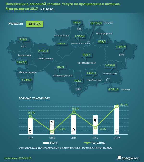 На втором месте по объемам инвестиций в основной капитал в сегменте услуг по проживанию и питанию — Атырауская область (9,4 млрд тг, рост к прошлогодним показателям — сразу в 3,6 раза). Замыкает тройку лидеров Алматы (4,5 млрд тг, на 14% меньше, чем в аналогичном периоде 2016, когда город усиленно инвестировал в сферу гостеприимства перед Универсиадой, прошедшей в южной столице с 29 января по 8 февраля 2017).