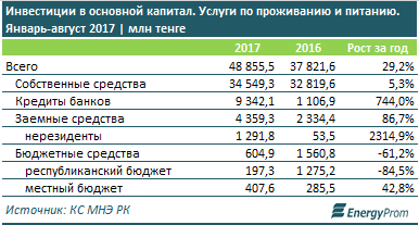 По итогам 8 месяцев объем инвестиций в основной капитал в сегменте услуг по проживанию и питанию достиг 48,9 млрд тг — это сразу на 29,2% больше, чем в аналогичном периоде годом ранее. Даже с учетом инфляции (в сопоставимых ценах) рост инвествливаний к прошлому году составил 20,6%.