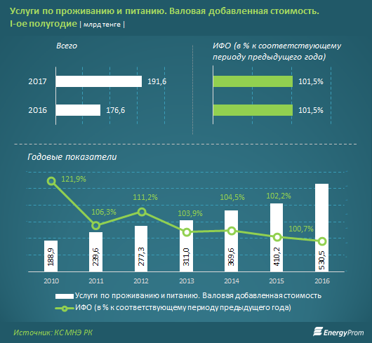 По итогам первого полугодия валовая добавленная стоимость сферы гостеприимства составила 191,6 млрд тг — это на 8,5% больше, чем в аналогичном периоде годом ранее, и на 1,5% больше — в сопоставимых ценах (рост с учетом инфляции).
