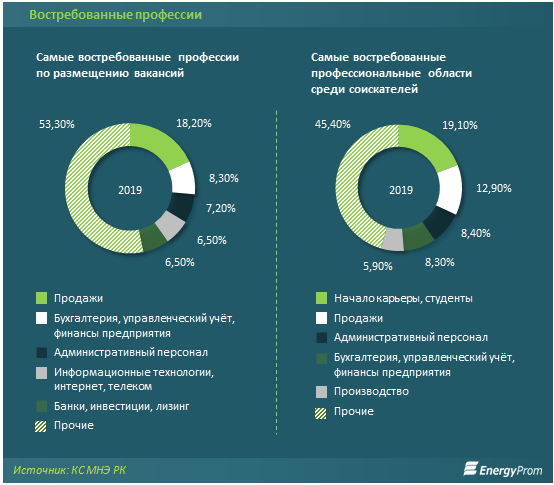 Самыми востребованными на рынке труда Казахстана стали представители следующих профессиональных областей: продажи (18,2%), бухгалтерия, управленческий учёт и финансы предприятия (8,3%), административный персонал (7,2%), информационные технологии, интернет и телеком (6,5%), а также банки, инвестиции и лизинг (6,5%).