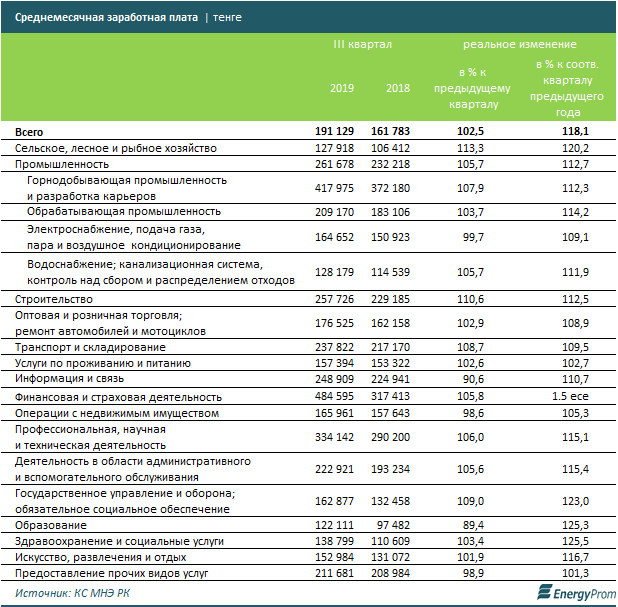 Напомним, по официальным данным Комитета по статистике МНЭ РК, по итогам третьего квартала 2019 года среднемесячная заработная плата в стране составляла 191,1 тыс. тг, против 186,5 тыс. тг во втором квартале и 161,8 тыс. тг — в третьем квартале 2018-го.