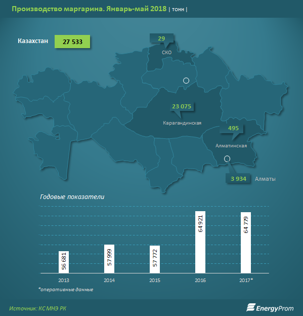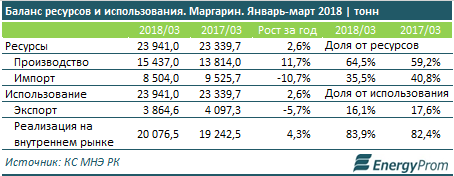 Казахстанские маслоделы обеспечили спрос на маргарин и аналогичные продукты уже на 64,5% по итогам I квартала текущего года, против 59,2% годом ранее.