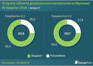 Наибольшие объёмы услуг организациями образования в области дошкольного воспитания и обучения традиционно оказываются за счёт бюджета (75,4%). По итогам IV квартала 2018 года за счёт бюджета было оказано услуг в области дошкольного обучения на 62,3 млрд тг (+14,6% за год). Ещё 24,4% услуг оказываются за счёт населения — 20,2 млрд тг (+13,1% за год).