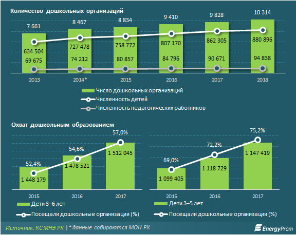Заметим, по факту в 2017 году в РК было 1,51 млн детей возраста от 3 до 6 лет включительно, а дошкольные учреждения посещали лишь 862,3 тыс. (охват — всего 57%).