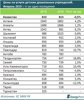 К марту цены на услуги детских дошкольных учреждений в среднем по РК сократились на 0,5% за год, до 810 тг за одно посещение. Дороже всего услуги дошкольных учреждений обходятся жителям столицы — 1940 тг за одно посещение (+4,2% за год), Алматы — 1686 тг (+1,2% за год) и Актау — 1042 тг (+6,2% за год).