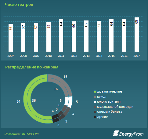 Драматических театров в стране — 36, кукольных — 16, также казахстанских театралов рады встретить 5 ТЮЗ-ов, 4 театра музыкальной комедии и 3 — оперы и балета.