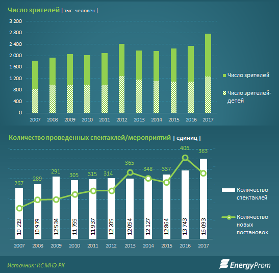 Количество проведенных спектаклей выросло на 17,1% за год, до 16,1 тысячи по итогам прошедшего года. Из них 2,9 тысячи было поставлено в культурной столице — Алматы (17,8% от РК), 2,3 тысячи — в ЮКО (15,5% от РК) и 2,1 тысячи — в Карагандинской области (13,3% от РК).