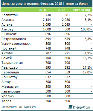 Цены на билеты выросли на 1,4% за месяц, и сразу на 7,2% за год — до 730 тенге в среднем за посещение театра.