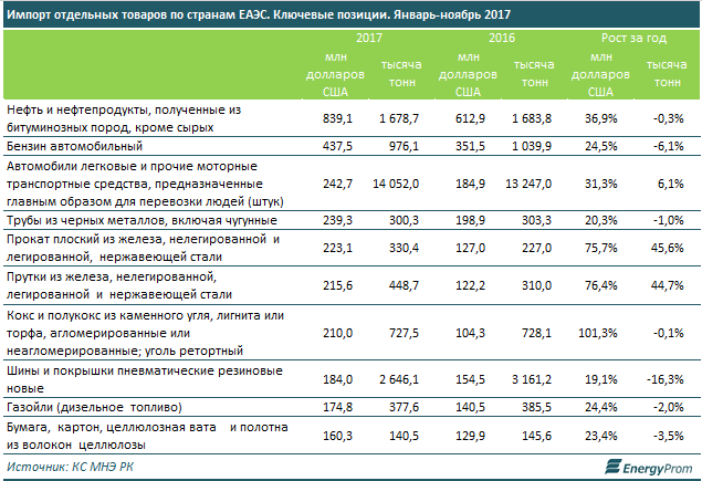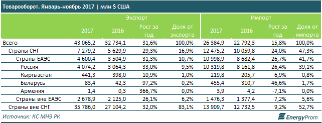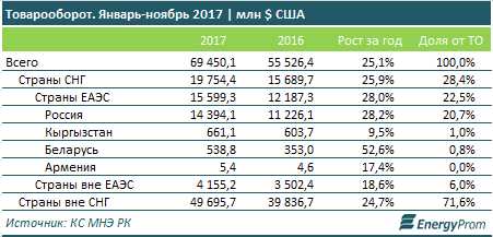 По итогам 11 месяцев объемы товарооборота РК достигли уже 69,5 миллиарда долларов (+25,1% за год), из которых 28,4% пришлось на страны СНГ, и 22,5% (15,6 млрд, +28% за год) — отдельно на страны ЕАЭС. Из них 14,4 млрд долл составил товарооборот с Россией.