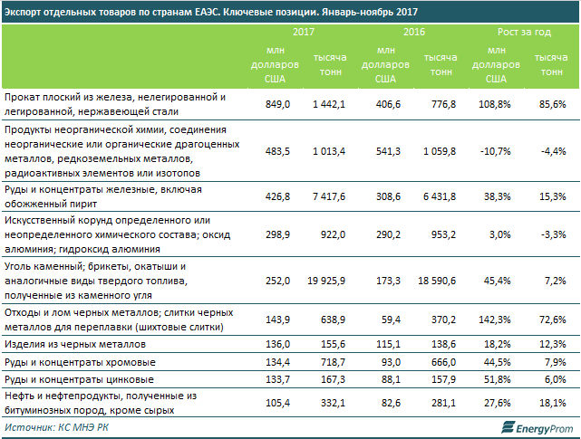 Среди ключевых экспортных позиций РК в ЕАЭС плоский прокат из железа и стали — 1,4 млн тонн на 849 млн долл, из которых 1,3 млн тонн на 781,8 млн долл пришлось на РФ.