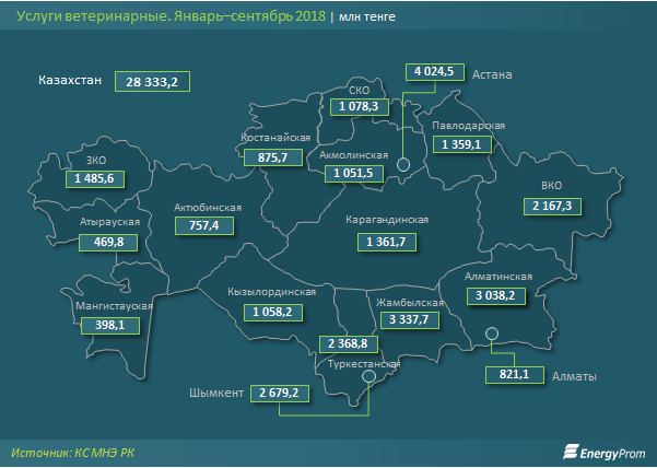 Также в тройке лидеров по объёмам ветеринарных услуг по итогам 9 месяцев ключевые животноводческие регионы: Жамбылская (3,3 млрд тг, что сразу на 48,5% больше, чем годом ранее) и Алматинская (3 млрд тг, +38,3% за год) области.