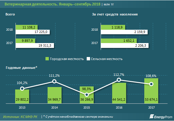 Ещё 17,2 млрд тг ветеринарных услуг пришлось на компании, зарегистрированные в городах (−10,8% за год).