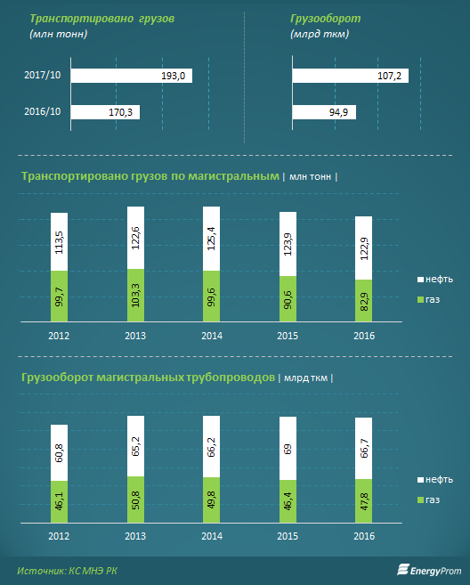 По итогам октября за 10 месяцев по трубопроводам РК было транспортировано 193 млн тонн нефти и газа — это на 13% больше прошлогодних показателей. Грузооборот за этот же период составил 107,2 млрд ткм — плюс 13,3% за год.