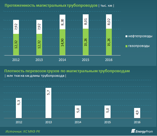 Протяженность трубопроводов по РК на начало года составляла 23,27 тысячи километров, против 20,18 тыс. км пятью годами ранее. Из них 15,26 тыс. км — газопроводы, 8,02 тыс. км — нефтепроводы.