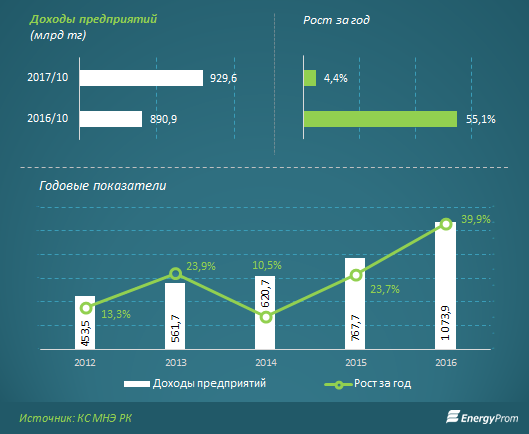 В целом по итогам 2016 года доходы в секторе достигли 1,07 трлн тг, +39,9% к 2015 году.