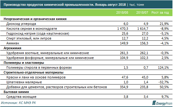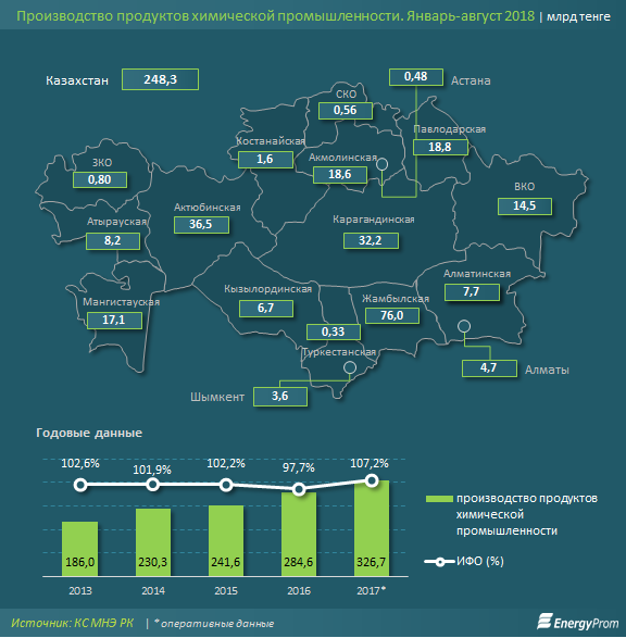 По итогам 8 месяцев предприятия химической промышленности РК выпустили продукции на 248,3 млрд тг — это сразу на 18,4% больше, чем годом ранее (и на 9,3% — в физическом объеме).