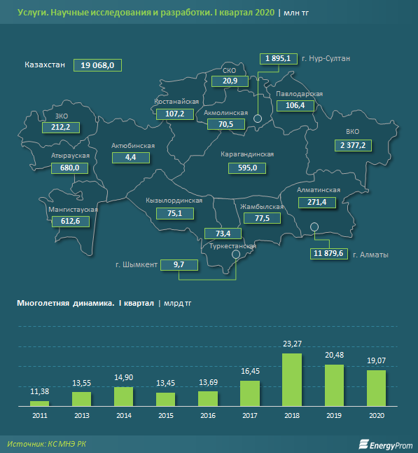 За первый квартал текущего года услуги в области научных исследований и разработок составили 19,1 млрд тг — на 6,9% меньше, чем в аналогичном периоде годом ранее (ИФО — 91,2%).