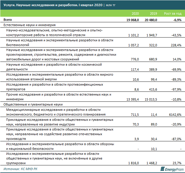В сфере естественных наук и инженерии, на которую пришлось 86,4% от всех услуг в секторе, наибольший объём средств был направлен на научно-исследовательские, опытно-методические и опытно-конструкторские работы в геологической отрасли: 1,1 млрд тг, против 1,9 млрд тг годом ранее. Ещё 1,1 млрд тг пришлось на научные исследования и экспериментальные разработки в области биотехнологий. Здесь на фоне общего спада наблюдается взрывной рост вложений: объём услуг подскочил к первому кварталу прошлого года сразу в 3,3 раза.