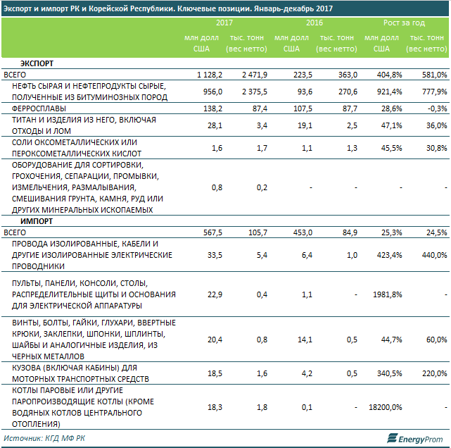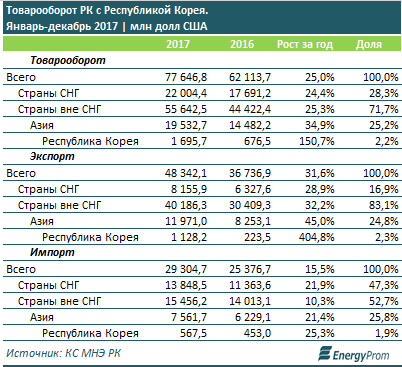 По итогам 2017 года товарооборот с Южной Кореей удалось нарастить сразу в 2,5 раза за год, до 1,7 млн долларов. Это очень значимый показатель, учитывая, что в целом товарооборот РК со странами мира прирос лишь на 25%.