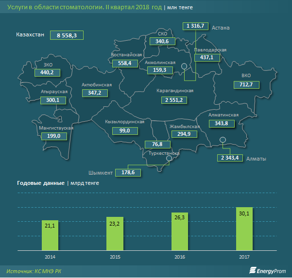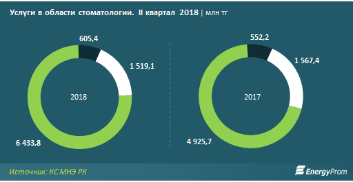 Услуги в области стоматологии — одни из самых коммерциализированных, и в основном они оплачиваются самими казахстанцами. Так, за II квартал 2018 года за счёт населения оказано 75,2% услуг в секторе. Жители и гости РК отдали стоматологам 6,4 млрд тенге — это на 30,6% больше, чем в аналогичном периоде годом ранее.