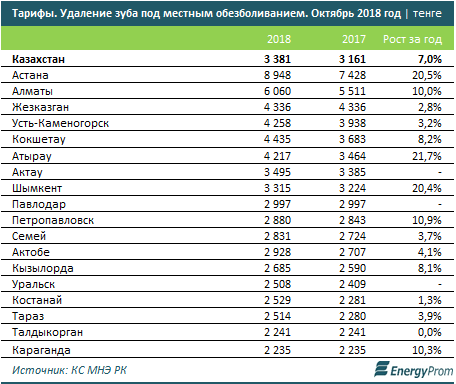 Цены на стоматологические услуги ожидаемо растут. Так, простейшая из услуг — удаление зуба под местным обезболиванием — обходилась в октябре 2018 в среднем по РК в 3381 тенге. Это на 7% дороже, чем годом ранее.