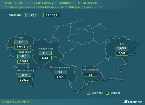 Добыча сырой нефти по итогам 2018 года в натуральном выражении составила 77,5 млн тонн, что на 6,3% больше, чем в 2017 году; в денежном — 12,2 трлн. тг. Почти две трети (60,9%) добычи пришлось на Атыраускую область (47,2 млн тонн, +11,6% за год), 23,3% — на Мангистаускую область (18 млн тонн, +0,7% за год) и 8,3% — на Кызылординскую область (6,4 млн тонн, −6,2% за год).
