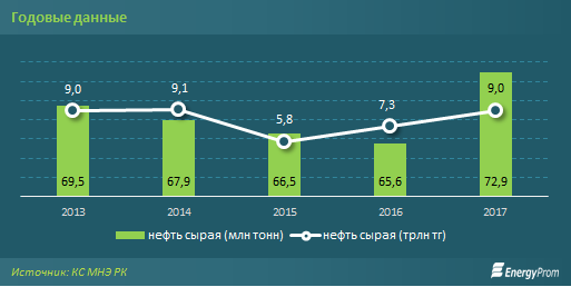По данным Министерства энергетики годовой план прошлого года по добыче нефти перевыполнен на 20%. Так, по итогам 2018 года на месторождении Кашаган добыли 13,2 млн тонн нефти (по плану — 11 млн тонн). На месторождении Тенгиз — 28,6 млн тонн, что выше плана на 1 млн тонн. Планы по добыче на Карачаганаке также достигнуты: за год объём добычи составил 12,2 млн тонн.
