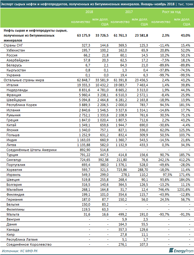 Основной импортёр казахстанской нефти — Италия (19,4 млн. тонн за январь–ноябрь 2018-го, на 1,4% больше, чем в аналогичном периоде годом ранее). В деньгах поставки составили 10,4 млрд долл. США — почти на 40% больше, чем годом ранее.