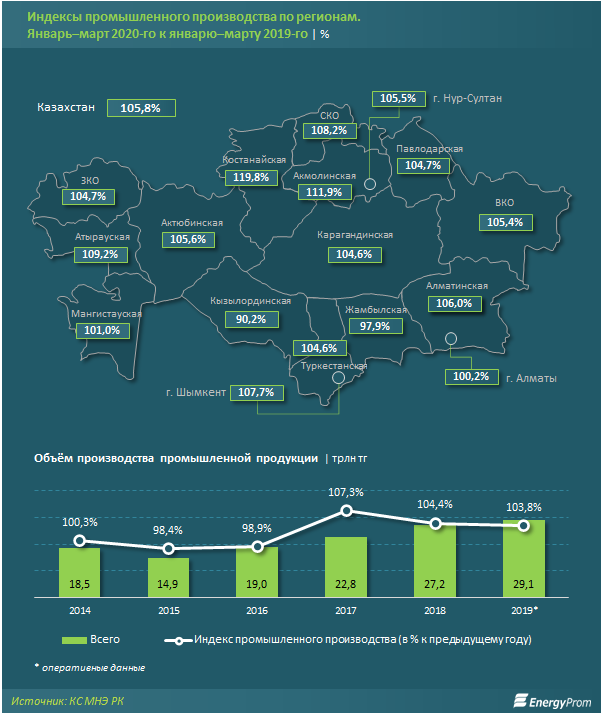 В целом по итогам I квартала рост объёмов производства зафиксирован в 15 регионах, снижение наблюдалось всего в двух — в Кызылординской и Жамбылской областях.