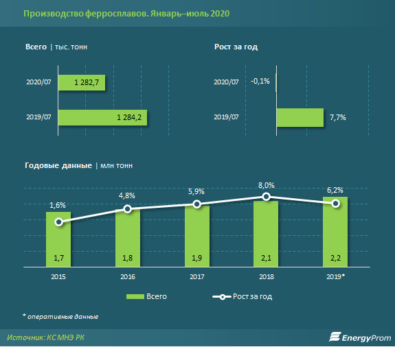За январь–июль 2020 года в стране произвели 1,3 млн тонн ферросплавов — практически столько же, сколько и годом ранее (лишь на 0,1% меньше). Среди них феррохрома — 1,1 млн тонн (минус 4,2% за год), ферросиликомарганца — 69,9 тыс. тонн (на 4,7% больше, чем годом ранее).