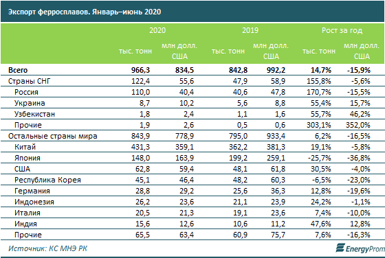 Экспорт ферросплавов за первое полугодие в натуральном выражении достиг 966,3 тыс. тонн — на 14,7% больше, чем год назад, а в денежном выражении он составил 834,5 млн долл. США — на 15,9%, меньше, чем годом ранее.