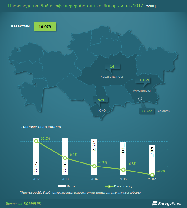 Производство чайно-кофейной продукции за январь-июль 2017 составило 10,08 тыс. тонн — всего на 1,8% больше, чем годом ранее. Стагнация обусловлена сокращением объемов выпуска в главном регионе-производителе — Алматы (83,1% от РК, против 86,7% годом ранее — это 8,38 тыс. тонн, минус 2,4% год-к-году). Среди наиболее значимых чайных компаний региона — например, ТОО «Tea House».