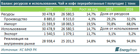 По итогам I полугодия 70,8% спроса на чай и кофе обеспечил импорт: 21,59 тыс. тонн, +19,5% год-к-году. Реализация чайно-кофейной продукции на внутреннем рынке страны выросла на 14,8%, до 28,94 тыс. тонн.