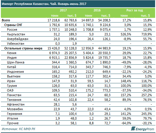 Ключевые поставщики чая в РК — Кения (6,97 тыс. тонн на 25,2 млн долл), Индия (6,92 тыс. тонн на 22,86 млн долл) и Россия (1,74 тыс. тонн на 10,25 млн долл).