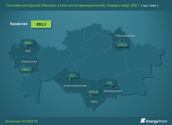 За январь-март 2017 в РК было произведено 810, 3 тыс. тонн моторного топлива — на 17,5% больше, чем в аналогичном периоде годом ранее.