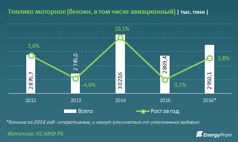 В многолетней динамике, после снижения производственных объемов в 2015 (минус 5,1% за год), в 2016 казахстанские НПЗ отыграли позиции — год закончен с приростом в 2,8%, до 2,95 млн тонн.