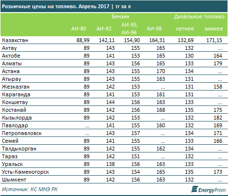 По итогам апреля 2017 цены на бензин наиболее популярной марки АИ-92 в среднем по РК поднялись на 14,8% к апрелю 2016, до 142,1 тг за литр. Впрочем, в сравнении с мартом цена незначительно снизилась (на 0,1%). Министр энергетики Канат Бозумбаев прокомментировал снижение цены на АИ-92 в сети автозаправочных станций «КазМунайГаз», где заявили, что бензин этой марки подешевел до 142 тенге. «Происходило затоваривание на рынке, спрос снизился», — сказал он. Продолжающаяся тенденция укрепления курса тенге к доллару содействовала удешевлению импорта топлива из России. Кроме того, уровень запасов АИ-92 в Казахстане способствовал стабилизации уровня оптовых цен на рынке.
