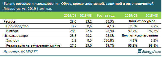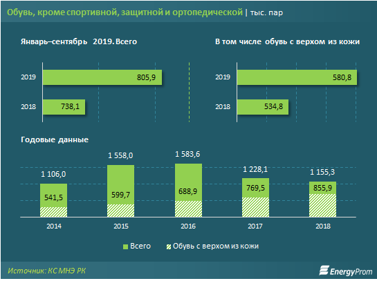 Производство обуви в РК выросло на 9,2% за год, до 805,9 тыс. пар за январь–сентябрь текущего года. Из них 580,8 тыс. пар составила кожаная обувь (+8,6% за год).