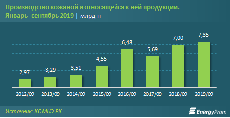 Производство кожаной продукции в целом, в которую помимо обуви входят кожи из шкур КРС и прочих крупных животных, по итогам трёх кварталов текущего года достигло 7,35 млрд тг, против 7 млрд тг в аналогичном периоде годом ранее.