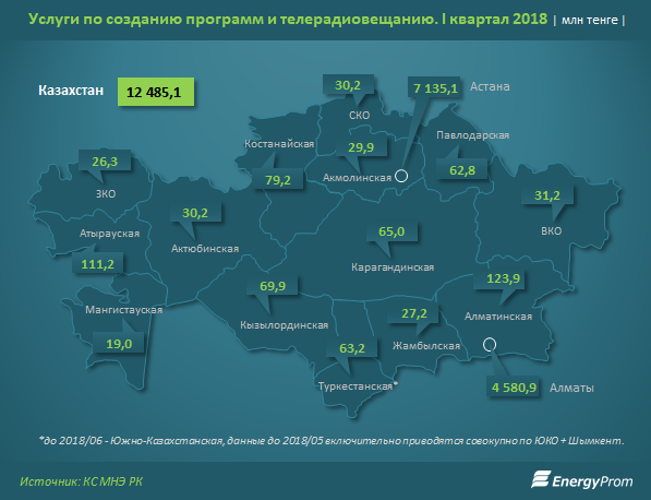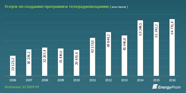 Радиовещание занимает лишь 7% от общего объема услуг в секторе (впрочем, годом ранее было лишь 4,7%). Примечательно, что услуги радиовещания — в значительном плюсе: сразу на 39,8% за год, до 880 млн тг.