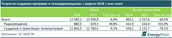Услуги по созданию и трансляции телепрограмм составили 11,6 млрд тг — сразу на 9,2% меньше, чем год назад.